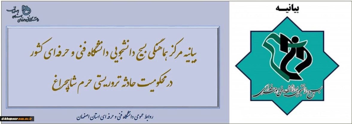 امتیاز دهید : بیانیه مرکز هماهنگی بسیج دانشجویی دانشگاه فنی و حرفهای کشور در محکومیت حادثه تروریستی حرم شاهچراغ 2 دوشنبه 9 آبان 1401 ساعت 11:28